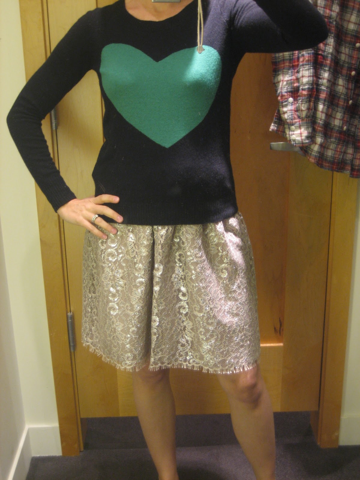 The sweater is very cute although I was thrown off by the lop-sidedness of the heart - I thought it made my boobs look a little lopsided too :) The material does not feel fabulous on and the fit is a bit odd. I wanted it to be a little bit longer. That being said, it's super cute and not that expensive for J Crew. The pants are awesome - super flattering and seem to be running a little big. I felt like the fit was almost a little "boyfriend" which I loved. Unfortunately $138 for onlined pants is a big pass for me. Plus I accidentally picked up those Checked Crops from Anthro. Oops.